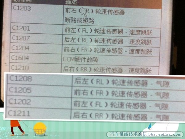 回到廠里,ABS燈再次點亮,讀取故障碼為上圖的C1208,C1205,C1202,C1211。同樣能清除。