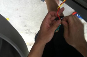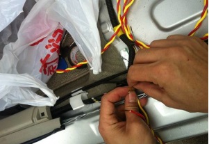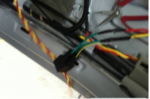 2,沿著這堆線打開一個(gè)缺口,找到綠線與黑白線剪開,用汽車電線(注:本人沒買到,因?yàn)橐I一大圈的.汽配店不散賣,故買了相對(duì)較粗的銅電線,沒辦法,電壓是12V,電流較大,所以盡量買大點(diǎn)的穩(wěn)妥點(diǎn))連接好綠線與黑白線,并用膠布纏好.